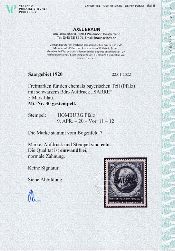 Saar Mi.-Nr. 30 oo Fotoattest